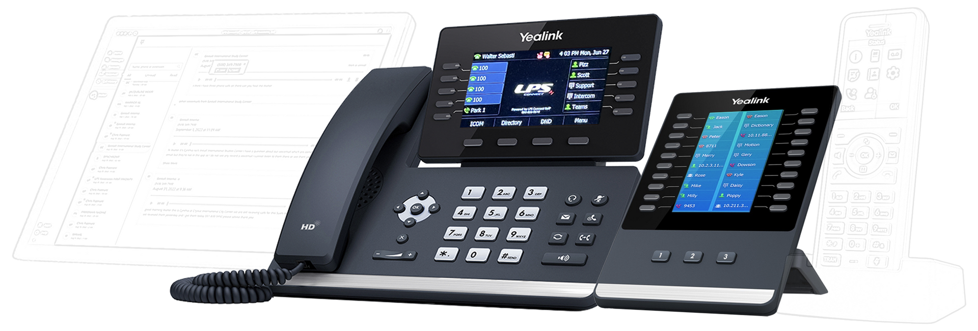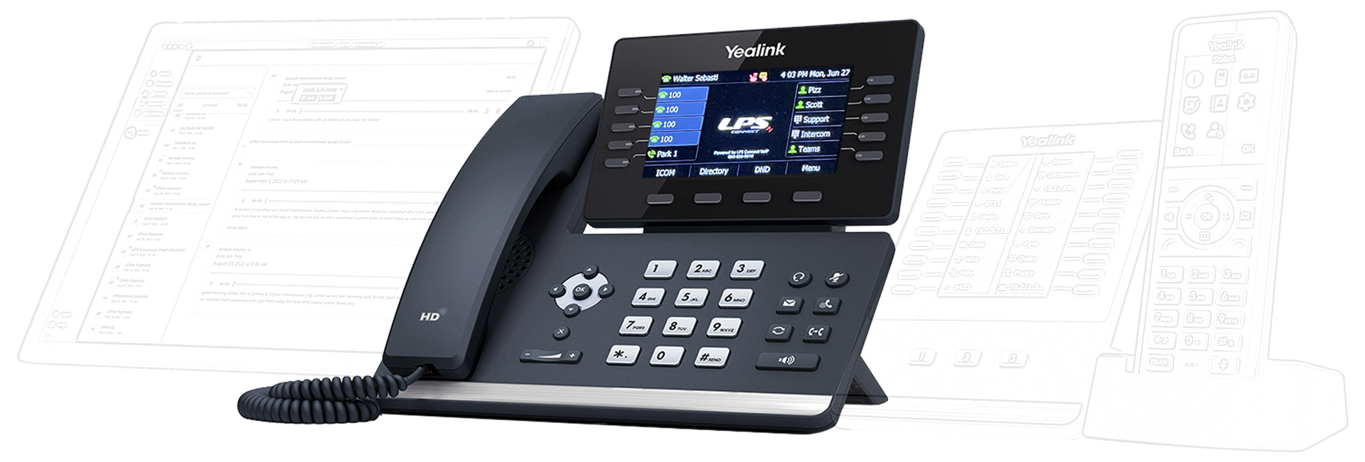 When paired with the T54W set, calls can be answered on the T54W and moved to the DECT handset to allow movement within the office. Conversely, calls can be answered on the DECT handset and re-homed to the desktop set.